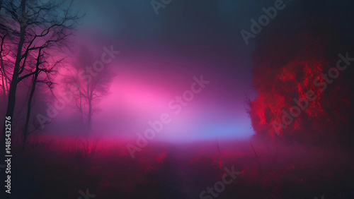 Mystical forest scene illuminated by vibrant pink and red light and foggy atmosphere