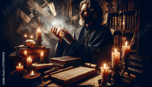 Mystical Man with Crystal Ball in Candlelit Study