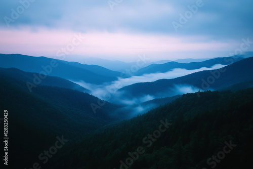 Mystical Mountainscape: A serene and captivating vista of rolling mountains shrouded in a delicate veil of mist, under a dusky sky that hints at the transition between day and night.