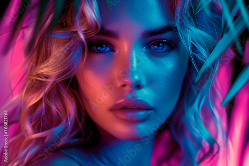Mystical portrait of a beautiful girl in the forest. Delicate neon glow. Fairytale image.
