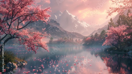 Mystical valley with a pink background, showcasing intricate details of enchanted forests and crystal-clear lakes.
