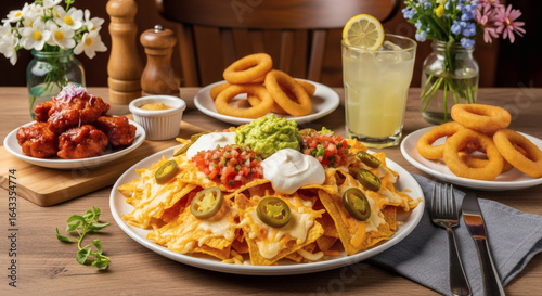 nacho, guacamole, salsa, sour cream, cheese, jalapeno, chips, tortilla, appetiser, food, platter, sharing, party food, wing, drink, lemonade, bar, pub, eatery, delicious, savoury, crunchy, fresh, herb, cilantro, meal, dining, table, wooden, rustic, background, high-quality, studio shot, comfort food, feast, widener, epicure, nobody, plate, dish, cookery, dinner, lunch, sauce