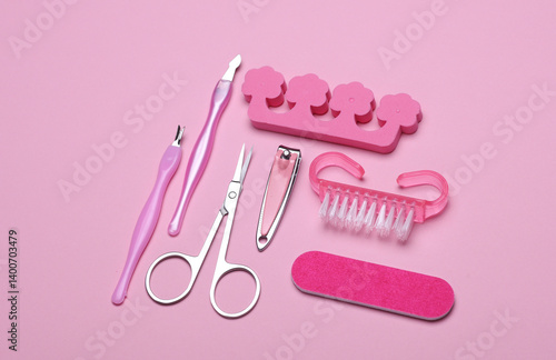 Nail care tools, manicure set on pink background. Flat lay. Top view