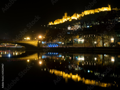 Nariakala fortress reflected in Kura river by night, Tbilisi, Georgia