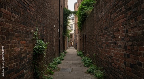 alley, brick, wall, narrow, path, passage, urban, city, street, architecture, building, brown, dark, shadow, texture, stone, plant, vegetation, overgrown, green, leaf, ivy, perspective, depth, contrast, light, shadow, atmosphere, mood, setting, background, scene, photo, image, picture, photo, visual, graphic, design, composition, line, geometric, shape, detail, tone, colours, shades