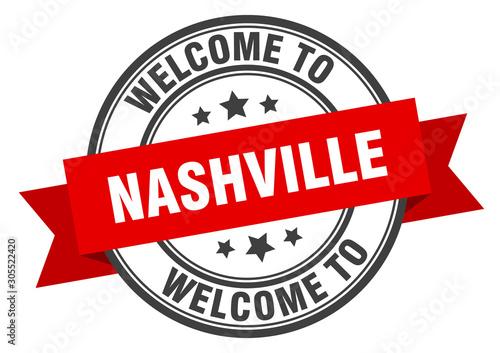 nashville, welcome, badge, band, banner, black, buttons, circle, emblem, hugs, greet, greeting, hospitality, insignia, isolated, label, location, peeler, red, ribbon, round, seal, signs, stamp, sticker, tags, template, travel, vector, vintage, white background