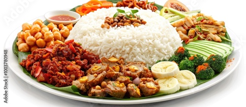 Nasi Kucing or Nasi Bungkus with various toppings displayed on a white background for a copy space image