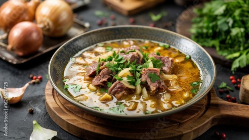 national dish, cookery, soup, lamb, tender, sliced, piece, broth, rich, flavorful, onion, fried, gold, fresh, herb, parsley, chopped, garnish, cilantro, dill, aromatic, garlic, infused, spice, black pepper, cumin, turmeric, yellow, colours, potato, chunk, hearty, vegetable, carrot, tomatoes, lemony, lemon, juice, sour, traditional, homemade, bowl, steaming, served, hot