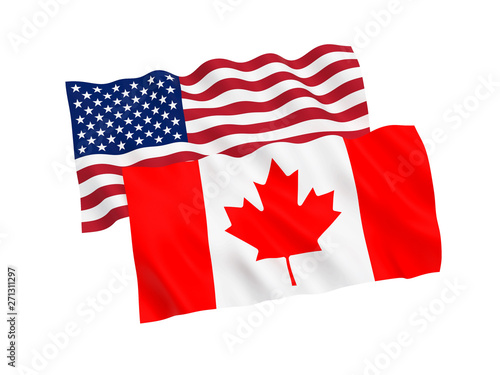 National fabric flags of Canada and America isolated on white background. 3d rendering illustration. 1 to 2 proportion.