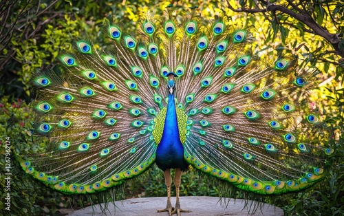 National Geographic Majestic Peacock displaying its vibrant feathers in a lush botanical garden, soft light highlighting the iridescent blues and greens
