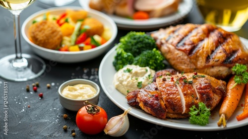 National Poultry Day. Gourmet grilled chicken with vegetables paired with a glass of white wine.