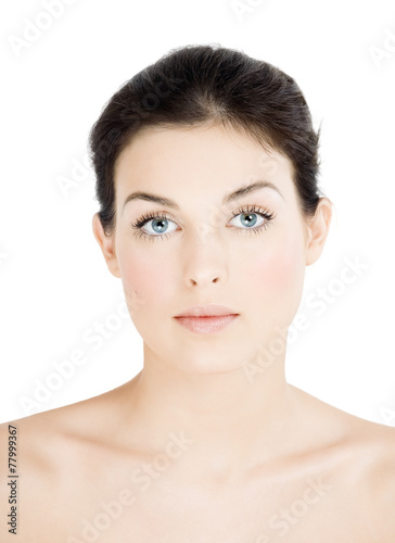 woman, beauty, beautiful, young adult, dark hair, studio shot, front view, closeup, color image, vertical, blue eye, human face, one person, portrait, white, isolated on white, high key