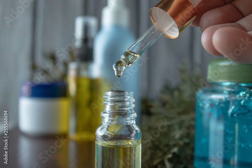 natural cosmetic essential oil in a bottle with a pipette. Facial, body treatment at home.