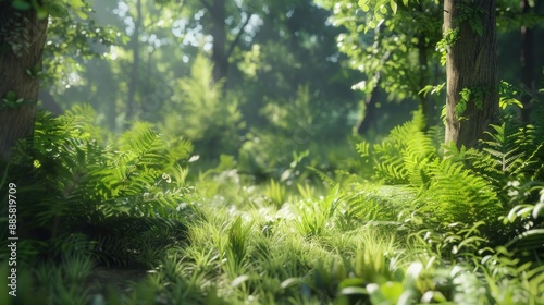 Natural dorest of woods with sunbeams through fog and leaves branch create mystic atmosphere. natural green beech forest in the morning light. busy forest with wood tree