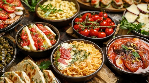 food, eatery, table, meal, epicure, plate, ready-to-eat, background, healthy eating, ingredient, lunch, meat, food and drink, dinner, variation, photo, vegetable, fruit, freshness, protein, tomatoes, horizontal, no people, aubergine, up high, seafood, buffet, international, diverse, cookery, dish, global, gastronomy, appetising, steak, bread, spaghetti