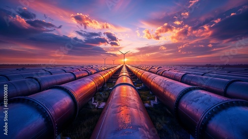 Natural gas pipelines with Oil refinery in the background Atmosphere at sunset Electric wind turbines