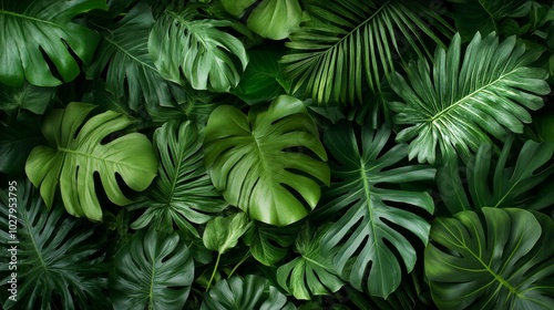 Natural green leaves with dark hues create a lush backdrop for various applications, including nature-inspired wallpapers and tropical-themed covers.