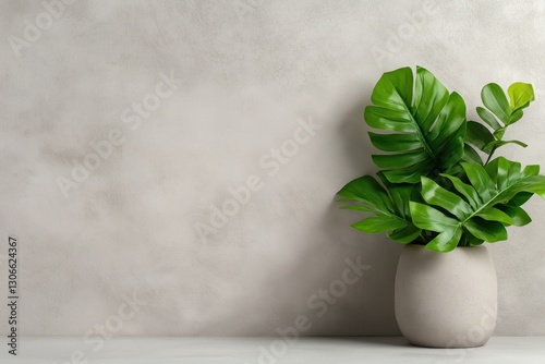Natural greenery complements subtle off-white wall with faint shadows for peaceful ambiance in minimalist setting