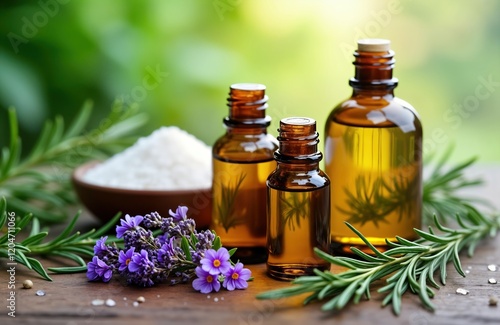 Natural herbal cosmetic ingredients including fresh flowers herbs, salt displayed on wooden surface. Glass bottles of essential oils infused with herbs for massage also visible. Eco-friendly, healthy