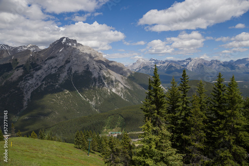Natural landscape - Bow River Valley, Rocky Mountains, coniferous forest and beautiful sky with clouds. Summer tourism in the mountains