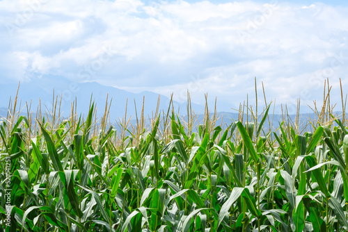 agriculture, background, blue, bright, cloud, corn, crop, cultivated, day, environment, farm, farming, farmland, field, food, grass, green, growth, harvest, healthy eating, horizon, land, landscape, leaf, natural, nature, organic, plant, plantation, rural, season, sky, spring, summer, sun, sunlight, sunny, sweet corn, sweet food, technology