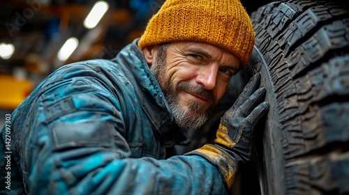 Natural light shot of mechanic adjusting tire pressure in an outdoor repair environment