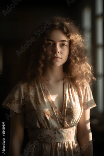 natural portrait of a European young girl in simple rustic clothes standing by the window, natural photo, soft light, ai generative art
