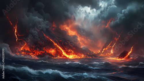natural, punishment, disaster, storm, wave, volcanic, lightning, lava, fire, smoke, global, warming, illustration