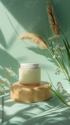 Natural skincare cream jar on a wooden stand with green leaves and flowers, soft sunlight creating shadows.