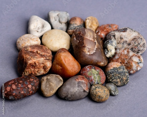 Natural stones in brown white and gray colors, placed by each other on a mauve purple background