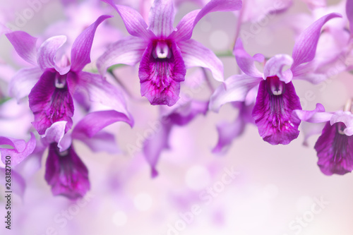 Nature background of purple orchid flowers in the garden during summer day with sunlight and blur bokeh background.