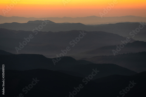 nature background with mountain silhouettes and a pine tree forest. Smooth gradient from dark to light orange caused by the long-focus lens and twilight. Carpathian mountains, Ukraine.
