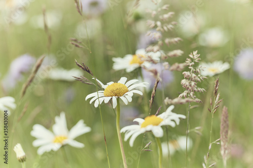 Nature background with wild flowers camomiles. Soft focus. Close up