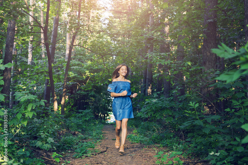 Nature, people and lifestyle concept - Beautiful young woman in dress runing in the summer forest