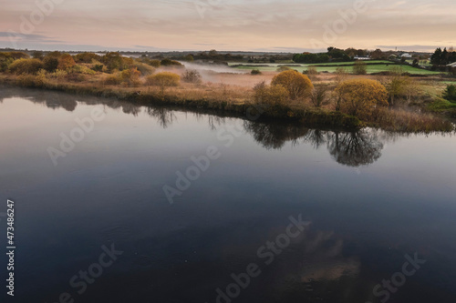Nature scene. Calm water and trees reflection. Fog over meadow in the background. Calm and relaxing atmosphere. Soft pastel cloudy sky. View on a River Corrib, Galway city, Ireland.