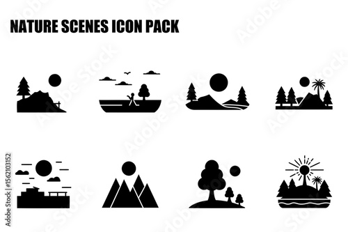 Nature scene icons depicting various landscapes and outdoor activities. Simple, stylized icons of a person in a boat, a person on a hill, and different views of mountains, forests, and water.