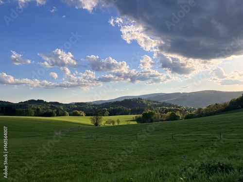 NAture view of the Czech landscape with mountains and forests at sunset. Scenic spring evening over the Orlicke Mountains,, and Dolni Morava region