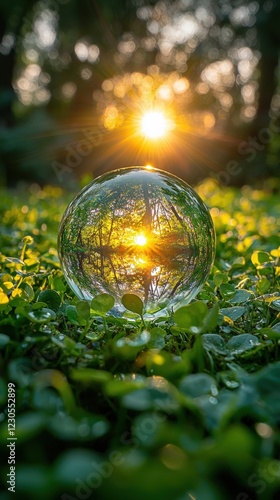 Nature's Reflection: Glass Orb Capturing Golden Sunset in Greenery