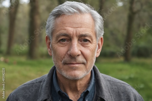 "Nature's Serenity: A Gentleman with Silver Hair Immersed in Green Outdoors"