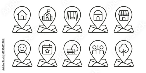 location, navigation, icon, set, map, guide, linear, home, school, playground, barn, store, smiley, calendar, park, people, tree, pointer, minimalist, simple, outline, pin, destination, marker, geolocation, symbol, basic, design, collection, template, interface, app, user, friendly, cartography, journey, placement, mapping, find, discover, direction, travel, urban, rural, transport, system