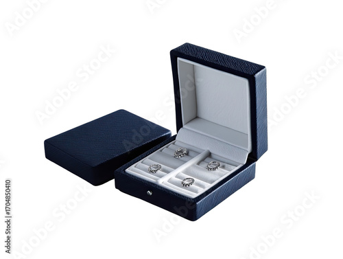 jewellery, box, leather, blue, open, compartment, earring, ring, storage, display, elegant, luxury, gift, present, accessory, fashion, design, high-end, premium, quality, hand-made, crafted, detail, smooth, texture, organised, classic, modern, stylish, sophisticated, refined, small, compact, precious, metal, silver, presentation, safe, secure, protection, case, holder