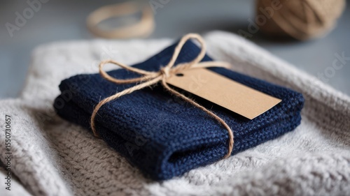 Navy knitted item wrapped with twine and tag, presented on a cozy background