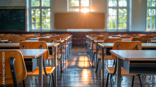 Neat and organized classroom with desks and chairs, warm lighting, and blur background of whiteboard and windows.