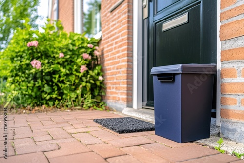 Neat Entrance with Black Trash Bin Outside the Front Door on a Sunny Day