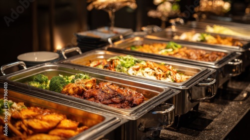 Neatly aligned chafing dishes containing assorted main courses on granite buffet countertop