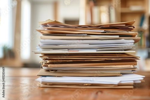 Neatly arranged stack of papers placed on a wooden table, A neat arrangement of documents on a wooden desk