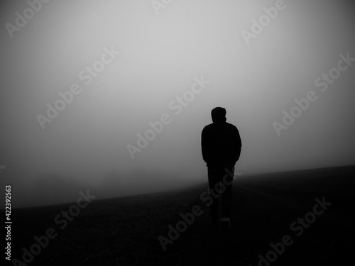silhouette, fog, black-and-white, light, heaven, person, nature, shadow, black, door, boy, dark, beach, walk, concept, back, standing, white, success, alone, young
