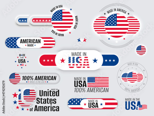 Neomorphic 3d mock up USA flag buttons set. Made in United States of America neomorphism trendy concept design element, logo, icon, sign, symbol. American made premium quality. Vector illustration