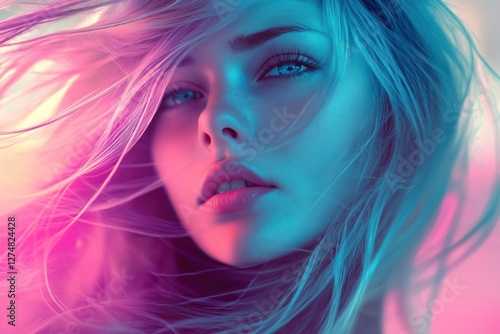 woman, portrait, face, eye, hair, beauty, blond, blue, pink, neon, light, studio, make-up, skin, lip, pretty, young, female, model, art, artistic, creative, style, fashion, girl, person, closeup, illuminated, vibrant, glow, coiffure, cosmetic, attractive, sensual, sensuality, youth, elegance, glamour, indoor, stylish, looking, look, facial, expression, human, caucasian, artifical, generation, ai