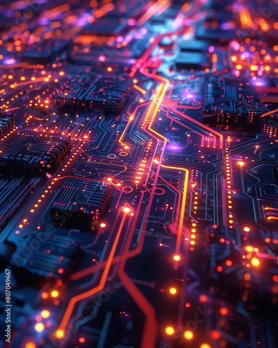 Neon circuit pathways, eyelevel, shimmering in miraculous colors, sharp focus, abstract tech art